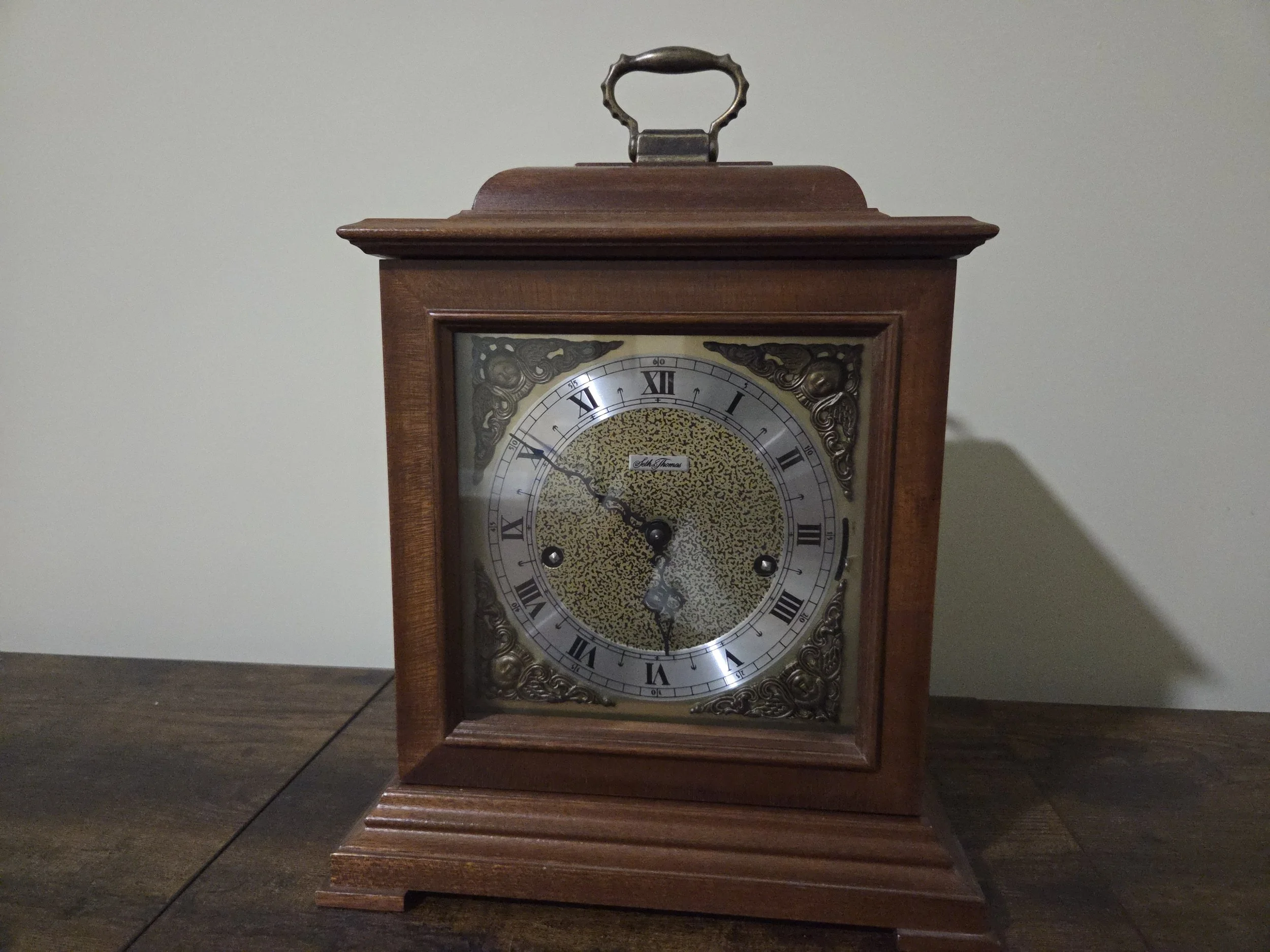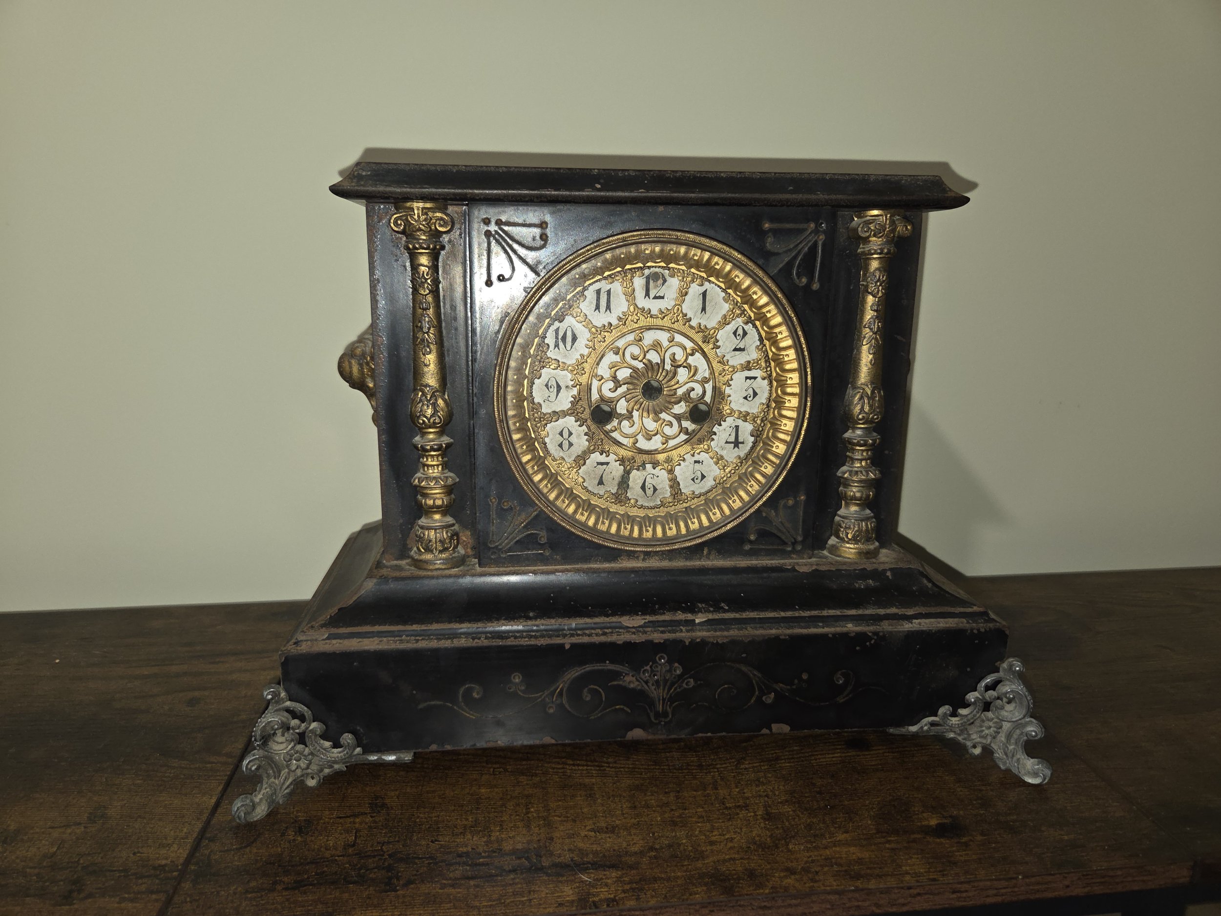 Roughly what does the shape of the case look like? Long, low case with a rounded or arched top Case is rectangular, might have faux marble, columns, or cast decorations Rectangular wooden or metal case with a carrying handle on top Narrow, pointed top, often with two finials Ornate oak or walnut with pressed patterns and a big “crown” on top Round porthole-style brass case, often on a wood base