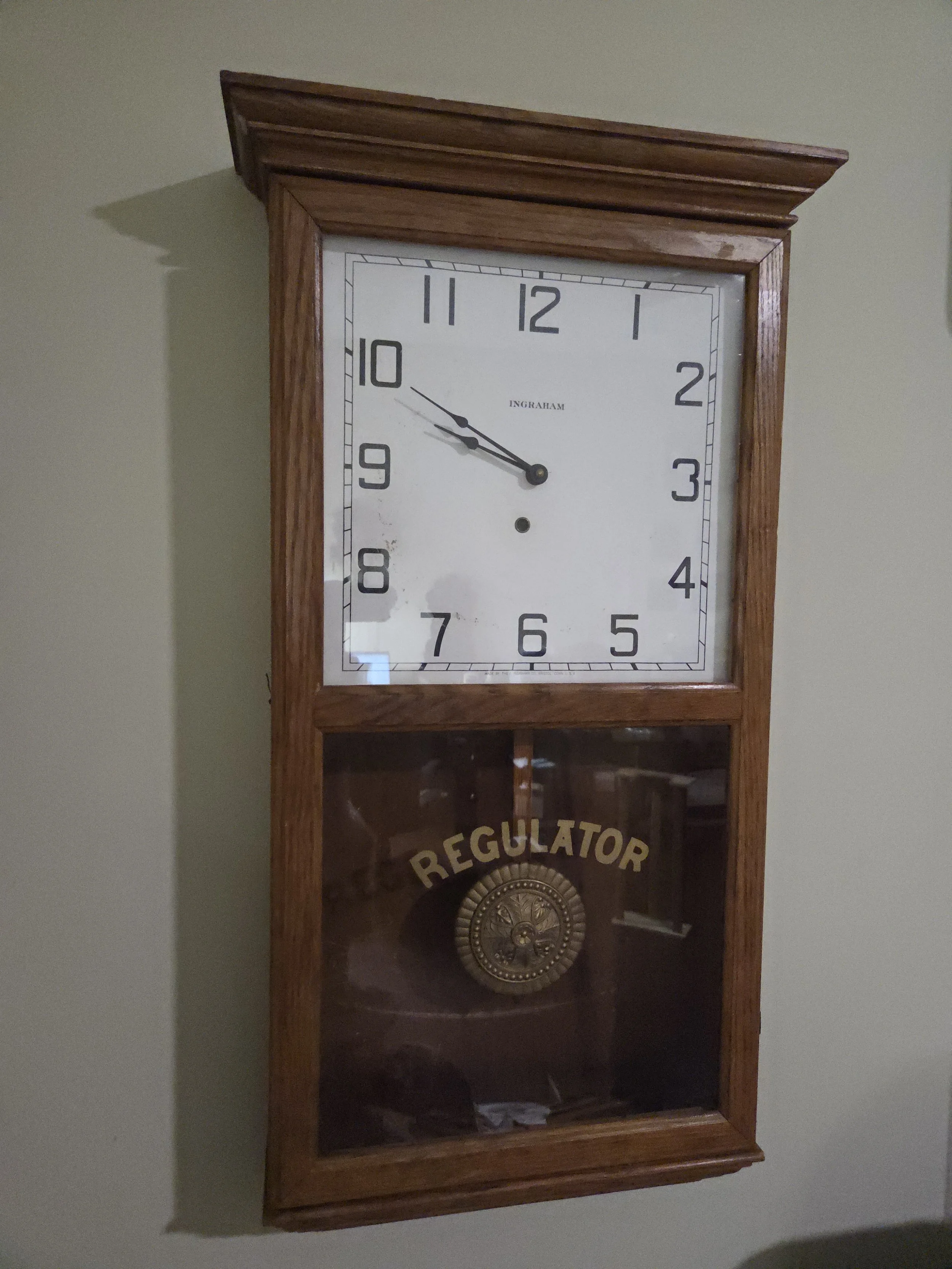 Roughly what does the shape of the case look like? Looks like a little house with animal carvings, usually with pinecone shaped weights hanging from chains Octagon top with a box or drop section below the dial Long case with a swinging pendulum visible through glass, often says Regulator on glass Banjo shape (round dial, narrow waist, larger box at the bottom) Round clock with no visible pendulum Any other wall mounted clocks