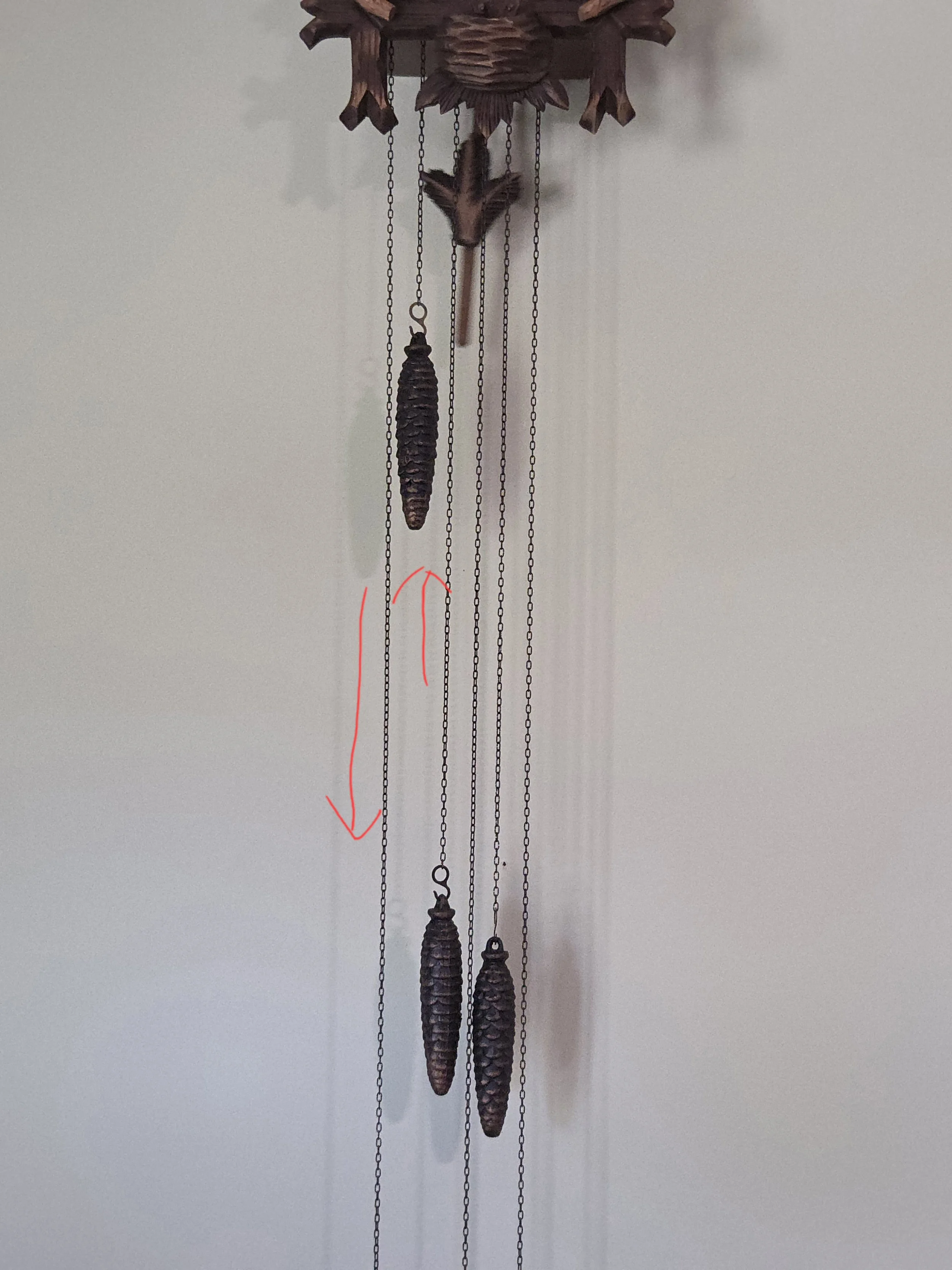 For chain-driven clocks, pull the free end of the chain downward to raise the weight on the opposite side. Pull evenly and avoid jerking motions.
